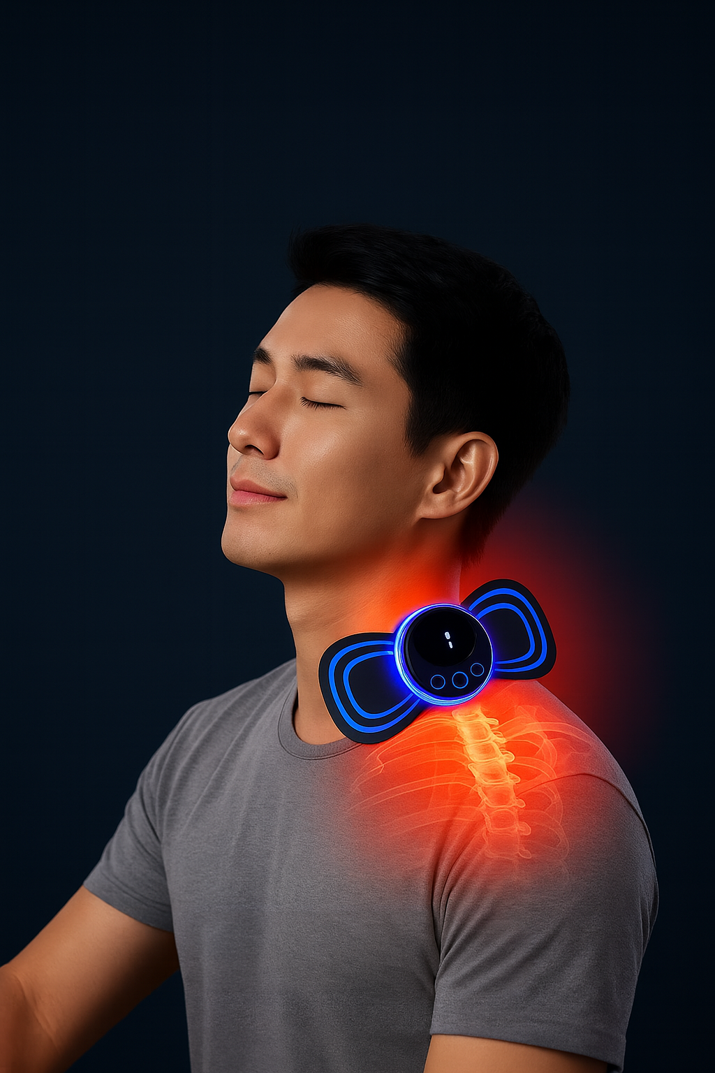 This image shows a man using a portable electronic neck massager placed on the back of his neck. The device features a sleek, modern design with soft gel pads that adhere to the skin, delivering soothing electrical pulses to relieve muscle tension and discomfort.