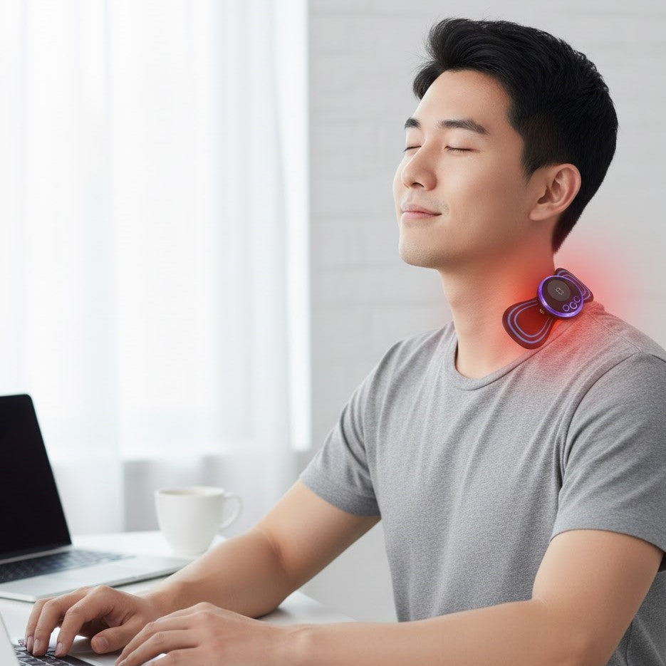 The image shows a man sitting comfortably at a desk while using a portable electronic neck massager placed on the side of his neck. He appears relaxed with his eyes closed, enjoying soothing relief from muscle tension. The device emits a soft red light, indicating active massage or heat therapy.